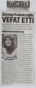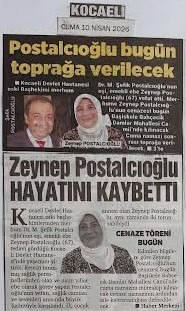 Kocaeli Devlet Hastanesi eski Başhekimi Kulak Burun Boğaz mütehassısı merhum Dr. M. Şefik Postalcıoğlu'nun sevgili eşi; Orhan, Melike ve Merve Postalcıoğlu kardeşlerin biricik anneleri, Barış ve Eliz’in anneanneleri (emekli ebe) Zeynep Postalcıoğlu Kocaeli Devlet Hastanesi’nde vefat etmiştir.