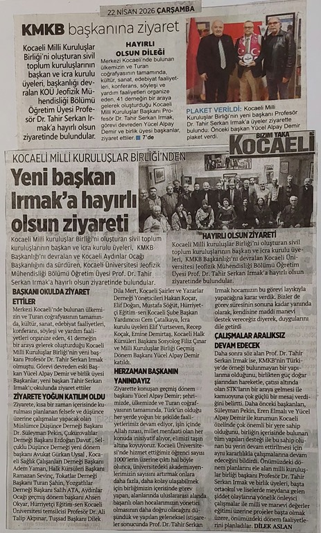 Kocaeli merkezli olarak faaliyet gösteren ve 41 derneğin bir araya gelmesiyle oluşan KMKB, yalnızca kentte değil, ülke genelinde ve Turan coğrafyasında kültür, sanat, edebiyat, söyleşi, konferans ve yardım faaliyetleriyle dikkat çekiyor. Bu geniş yapının yeni başkanı olan Prof. Dr. Tahir Serkan Irmak, görevi devreden Yücel Alpay Demir ve birlik üyeleri tarafından okulunda ziyaret edildi.