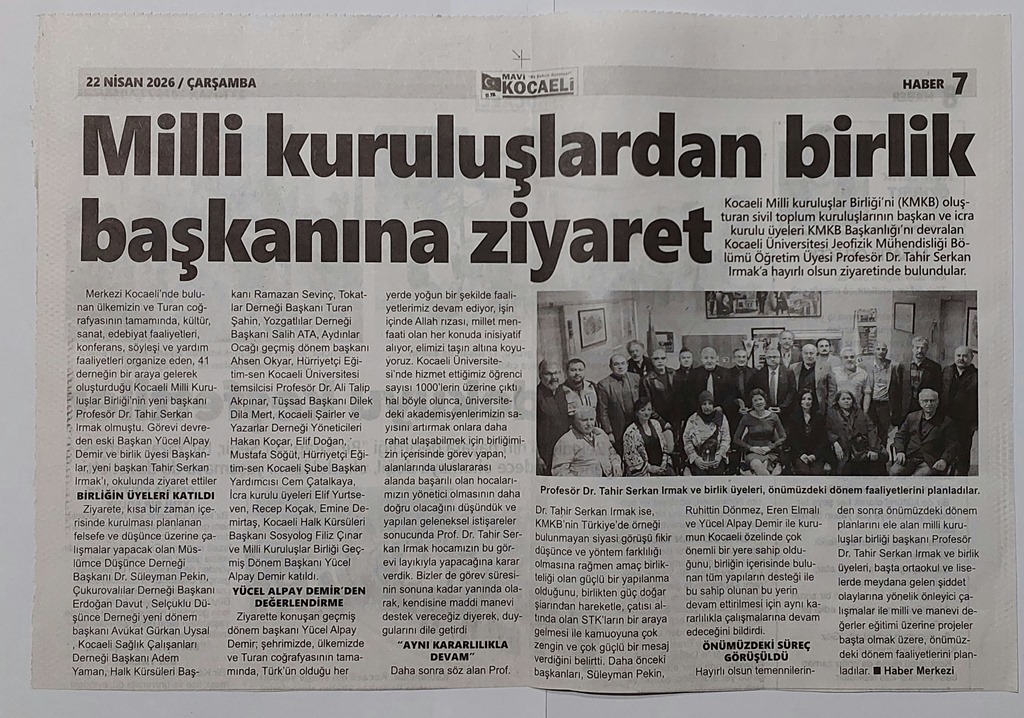 22 Nisan 2026 Çarşamba / Kocaeli Aydınlar Ocağı ve Kocaeli Milli Kuruluşlar Birliği olarak, eski Başkanlarımızdan Sayın Ahsen Okyar’a amcasının vefatından dolayı taziye ziyaretinde bulunduk.