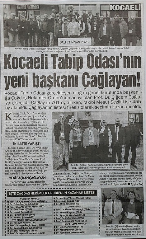 Kocaeli Tabip Odası’nın genel kurulu, bugün oda binasında gerçekleştirildi. İki listenin yarıştığı seçimde Çiğdem Çağlayan rakibini ezdi geçti
