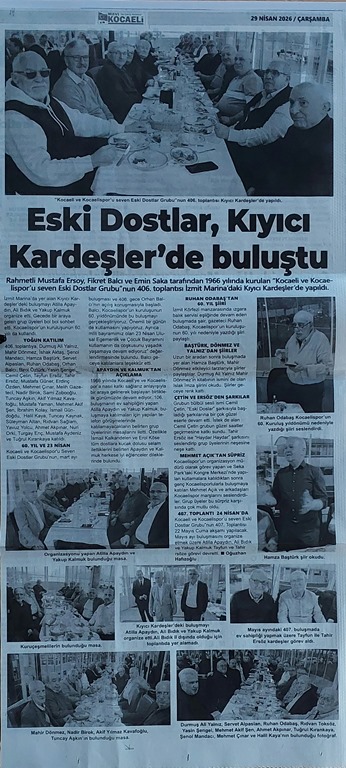 ESKİ DOSTLAR; KIYICI KARDEŞLER’de.. Rahmetli Mustafa Ersoy, Fikret Balcı ve Emin Saka tarafından 1966 yılında kurulan “Kocaeli ve Kocaelispor’u seven Eski Dostlar Grubu”nun 406. toplantısı İzmit Marina’daki Kıyıcı Kardeşler’de yapıldı. İzmit Marina’da yer alan Kıyıcı Kardeşler’deki buluşmayı Atilla Apaydın, Ali Bıdık ve Yakup Kalmuk organize etti. Gecede bir araya gelen grup üyeleri bol bol sohbet etti. Kocaelispor’un kuruluşunun 60. yılı da kutlandı.