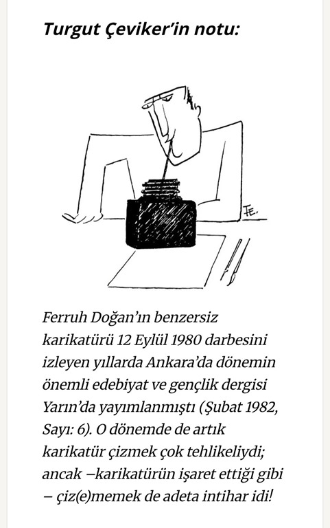 Söz konusu karikatürde Ferruh Doğan hayatta olmadığı için karikatürde ne demek istediğini kendisine soramıyoruz. Hayatta olsaydı karikatürde ne demek istediğini en iyi o anlatırdı. Çünkü karikatürü çizen kendisi olduğu için "doğal olarak" ne demek istediğini en iyi kendisi bilir.
