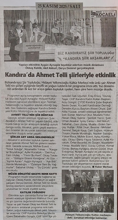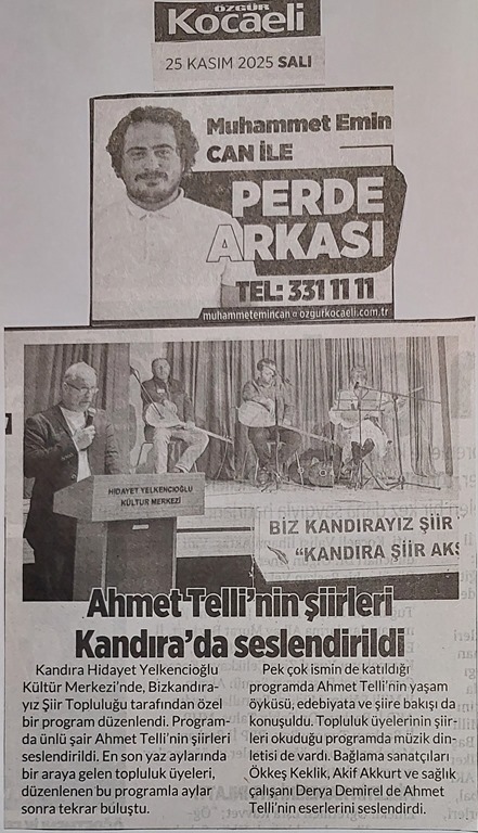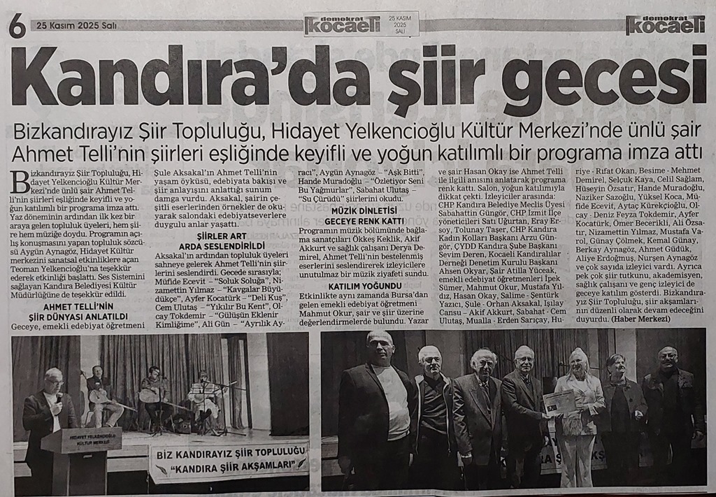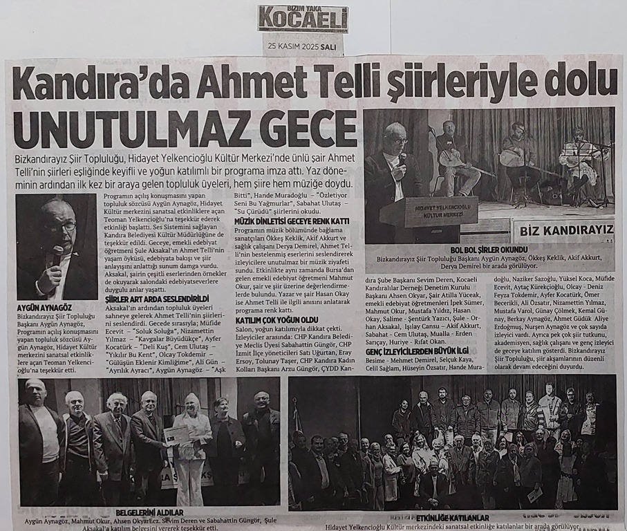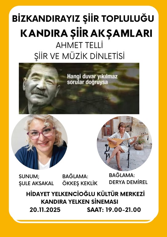 20 Kasım 2025 Perşembe / Bizkandırayız Şiir Topluluğu, Hidayet Yelkencioğlu Kültür Merkezi’nde ünlü şair Ahmet Telli’nin şiirleri eşliğinde keyifli ve yoğun katılımlı bir programa imza attı. Yaz döneminin ardından ilk kez bir araya gelen topluluk üyeleri, hem şiire hem müziğe doydu.