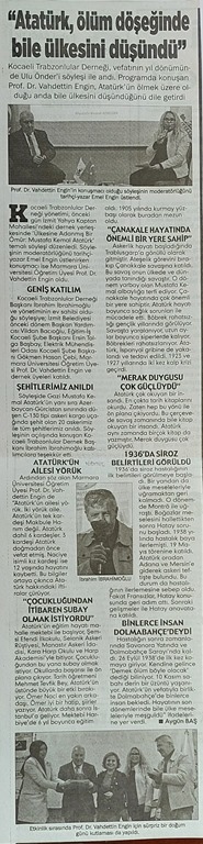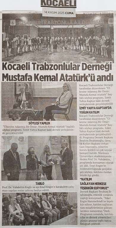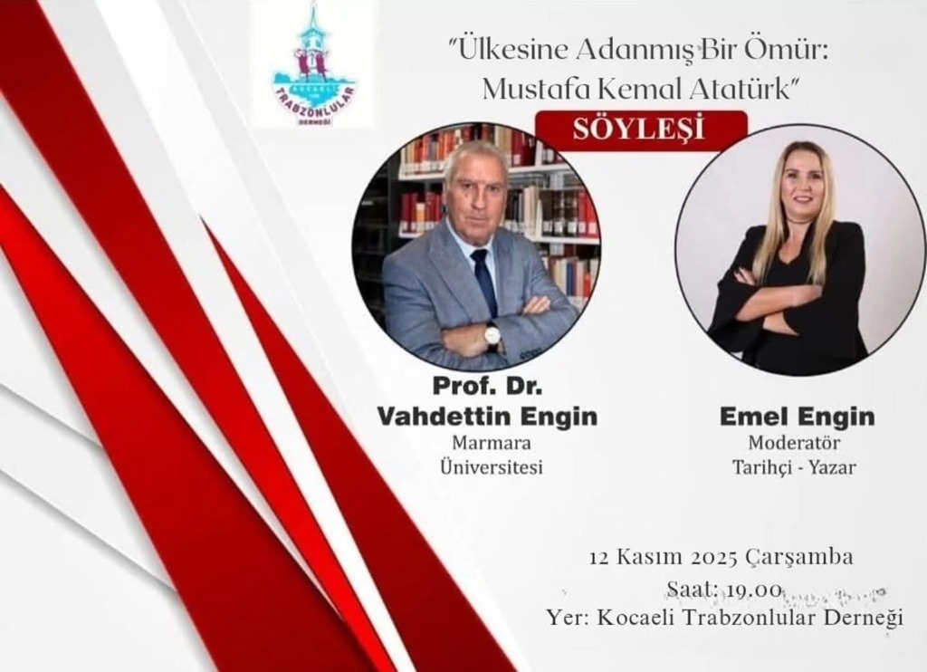 Kocaeli Trabzonlular Derneği, “Ülkesine Adanmış Bir Ömür: Mustafa Kemal Atatürk” temalı söyleşi düzenledi. Marmara Üniversitesi Öğretim Üyesi Tarihçi Prof. Dr. Vahdettin Engin’in konuşmacı olduğu programda, Atatürk’ün çocukluk yıllarından vefatına kadar bilinmeyen yönleri anlatıldı.