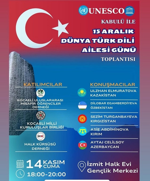 14 Kasım 2025 Cuma /Türk dünyasının farklı coğrafyalarından gelen öğrenciler ve sivil toplum kuruluşlarının temsilcileri, 14 Kasım 2025 Cuma günü İzmit Halk Evi Gençlik Merkezi’nde bir araya gelerek 15 Aralık “Dünya Türk Dili Ailesi Günü”nü kutladı.