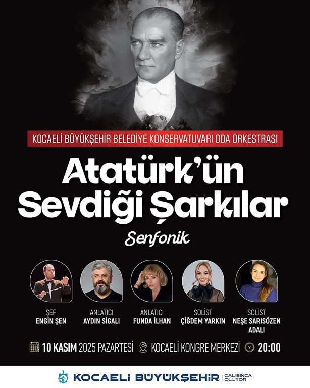 Kocaeli Büyükşehir Belediye Konservatuvarı Oda Orkestrası, Ulu Önder Mustafa Kemal Atatürk’ün en sevdiği şarkıları bu kez senfonik bir yorumla sizlerle buluşturuyor.