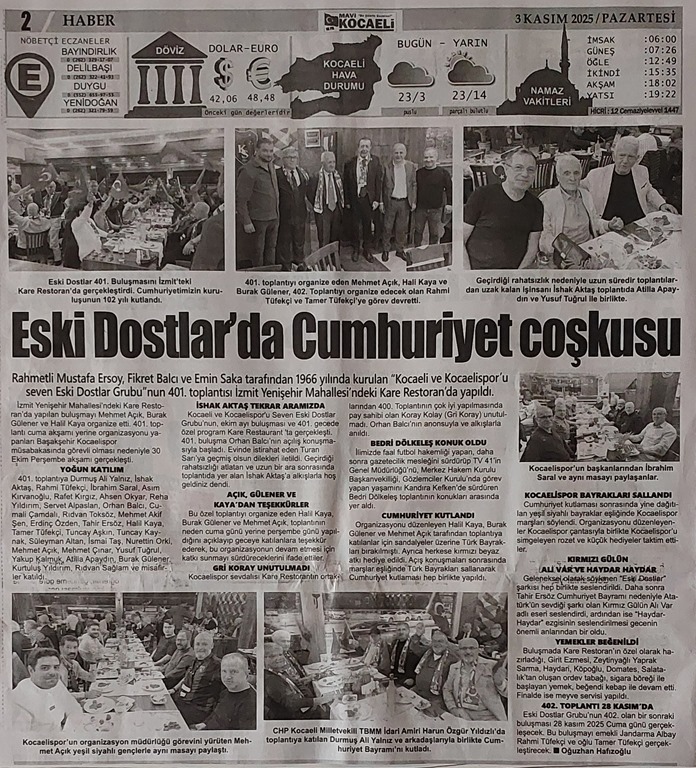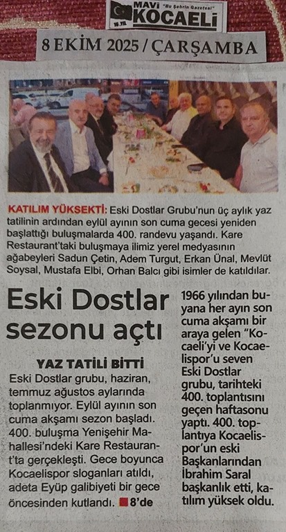 27 Eylül 2025 Cuma / Rahmetli Emin Saka, Mustafa Ersoy ve Fikret Balcı tarafından 1966 yılında kurulan “Kocaeli ve Kocaelispor’u seven Eski Dostlar Grubu”nun 400. toplantısı İzmit Yenişehir Mahallesi’ndeki Kare Restoran’da yapıldı.