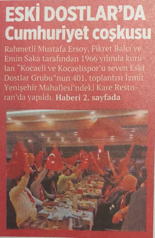 Rahmetli Mustafa Ersoy, Fikret Balcı ve Emin Saka tarafından 1966 yılında kurulan “Kocaeli ve Kocaelispor’u seven Eski Dostlar Grubu”nun 400. toplantısı İzmit Yenişehir Mahallesi’ndeki Kare Restoran’da yapıldı. Yaz tatilinden dönen grup gönüllerince eğlenip hasret giderdi.