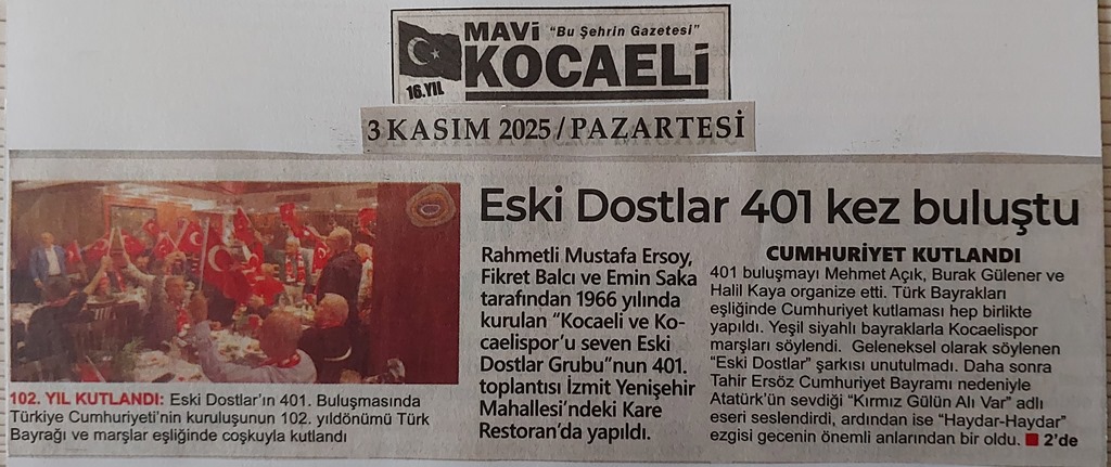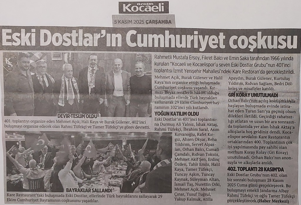 30 Ekim 2025 Perşembe / Rahmetli Mustafa Ersoy, Fikret Balcı ve Emin Saka tarafından 1966 yılında kurulan “Kocaeli ve Kocaelispor’u seven Eski Dostlar Grubu”nun 401. toplantısı İzmit Yenişehir Mahallesi’ndeki Kare Restoran’da yapıldı.