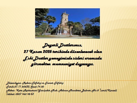 Eski Dostlar Grubu’nun 402. olan bir sonraki buluşması 28 Kasım 2025 Cuma günü gerçekleşecek. Bu buluşmayı emekli Jandarma Albay Rahmi Tüfekçi ve oğlu Tamer Tüfekçi gerçekleştirecek.