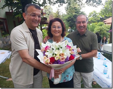 Hasan Uzunhasanoğlu, toplantıya ev sahipliği yapan Büyükkaya çiftine teşekkür edip, bir buket çiçeği takdim ederken