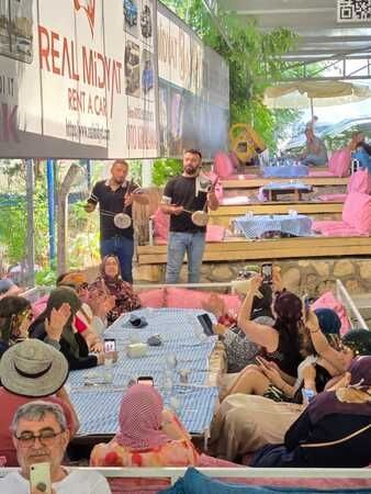 Masa altında buz gibi "BEYAZSU"ya girmiş ayaklar dinlenirken Mardin kemençesi eşliğinde öğle yemeği