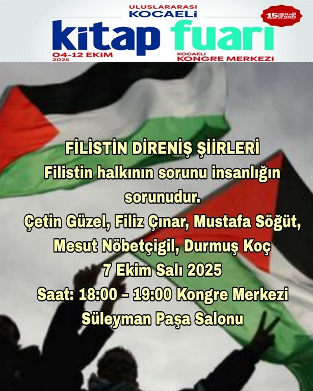 7 Ekim 2025 Salı / Kongre Merkezi Süleyman Paşa Salonunda Filistin Direniş Şiirleri; Çetin Güzel, Filiz Çınar, Mustafa Söğüt, Mesut Nöbetçigil, Durmuş Koç ve Turan Kayıkçı tarafından dile getirildi.