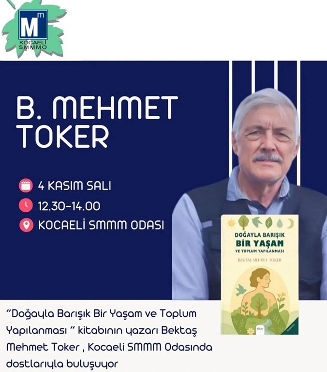 4 Kasım 2025 Salı / B. Mehmet Toker meslektaşın “DOĞAYLA BARIŞIK BİR YAŞAM VE TOPLUM YAPILANMASI” isimli kitabını KSMMMO’sında imzalatıp edindim. Özcan Bülbül ve birçok dostla karşılaşıp görüşme imkanı buldum.