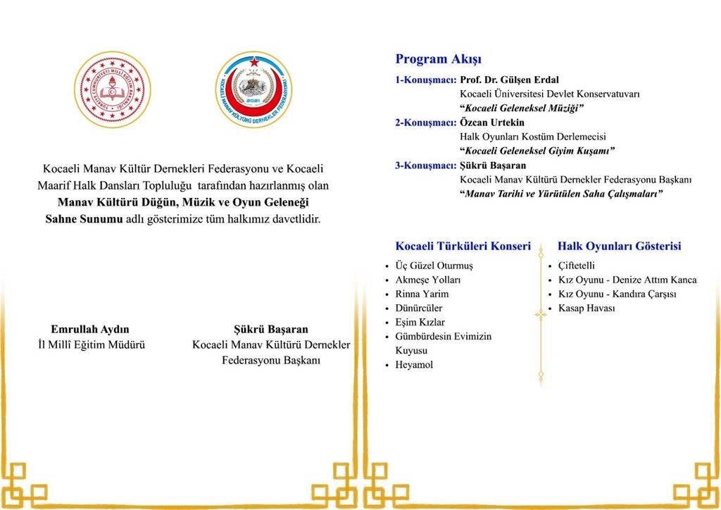 Programda; Kocaeli türküleri, Manav kültürüne ait kadın–erkek meydan düğün oyunları, geleneksel giyim-kuşam ve kültürel anlatılar yer alacaktır.