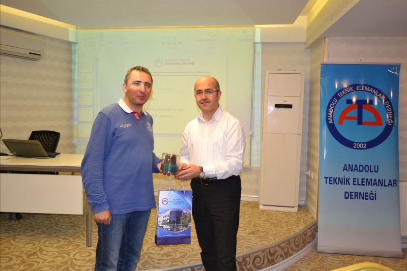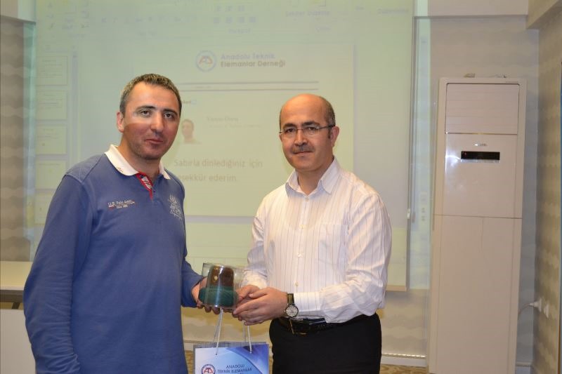 Başarılı sunumu sonrası soruları cevaplayan Yalova Üniversitesi Bilgisayar Bölümü Öğretim Görevlisi Yunus Özen’e Konya Anadolu Teknik Elemanlar Dernek Başkanı Reşat Kır tarafında teşekkür edilerek plaket ve hediyeler takdim edildi.