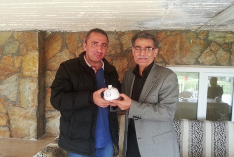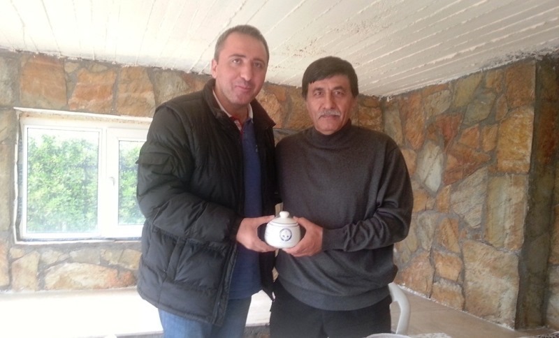 Yunus Özen, Amerika’dan misafir gelen Hasan Güçlü’ye Ocağın hediyesini takdim ederken