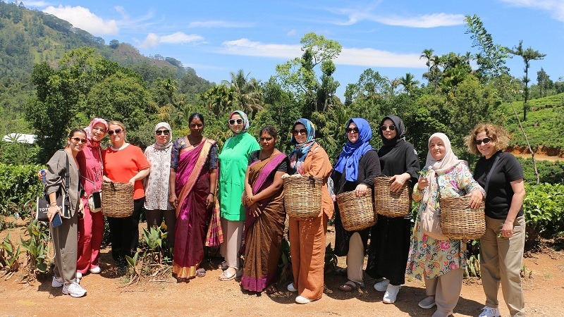 Kandy’ de Yağmur Sözer, Emine Uzunhasanoğlu, Ayşe Çapçı, Zahide Delioğlan, Dr. Neziha Özcan, Dr. Fatma Emre Taşolar, Arzu Yücel, Nurdan Kocagöz, Muazzez Aydemir, Deniz Sözer ve Sri Lanka’lı hanımlar çay toplamaya hazırlanırken