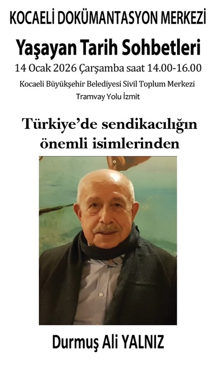 Kocaeli Dokümantasyon Merkezi, 14.01.2026 günü, Sendikacı Durmuş Ali Yalnız ile, Yaşayan Tarih Sohbetleri kapsamında bir söyleşiyi İzmit merkezde Tramvay Yolu üzerinde bulunan Kocaeli Sivil Toplum Merkezi'nde gerçekleştirdi ve kayıt altına aldı.