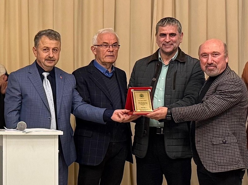 Salim Yaşar, Necat Çakır ve Av. Hüseyin Acurman birlikte Adnan Turan’a plaketini takdim ederken