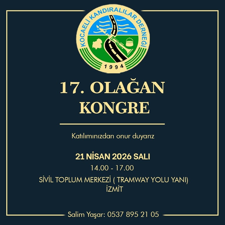 Kocaeli Kandıralılar Derneği, iki yılda bir gerçekleştirilen olağan kongre sürecine girdi. 21 Nisan Salı günü İzmit Sivil Toplum Merkezi’nde düzenlenecek olan 17. Olağan Kongre’de, mevcut başkan Salim Yaşar aday olmayacağını açıklarken; derneğin başkan vekili Batuhan Üretürk’ün başkanlık koltuğuna oturması bekleniyor.