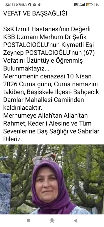Zeynep Postalcıoğlu’nun cenaze programı da netleşti. Postalcıoğlu’nun cenazesi, 10 Nisan Cuma günü Başiskele Damlar Camii’nde kılınacak cenaze namazının ardından toprağa verilecek. Merhume, eşi Dr. Şefik Postalcıoğlu’nun da kabrinin bulunduğu Damlar Mezarlığı’nda defnedilecek. Ailenin yakınları, cenazeye katılacak vatandaşlardan dua beklediklerini ifade etti. Bu vefatla birlikte, Kocaeli’de iz bırakan bir ailenin iki önemli ismi aynı kabristanda yan yana ebediyete uğurlanmış olacak.