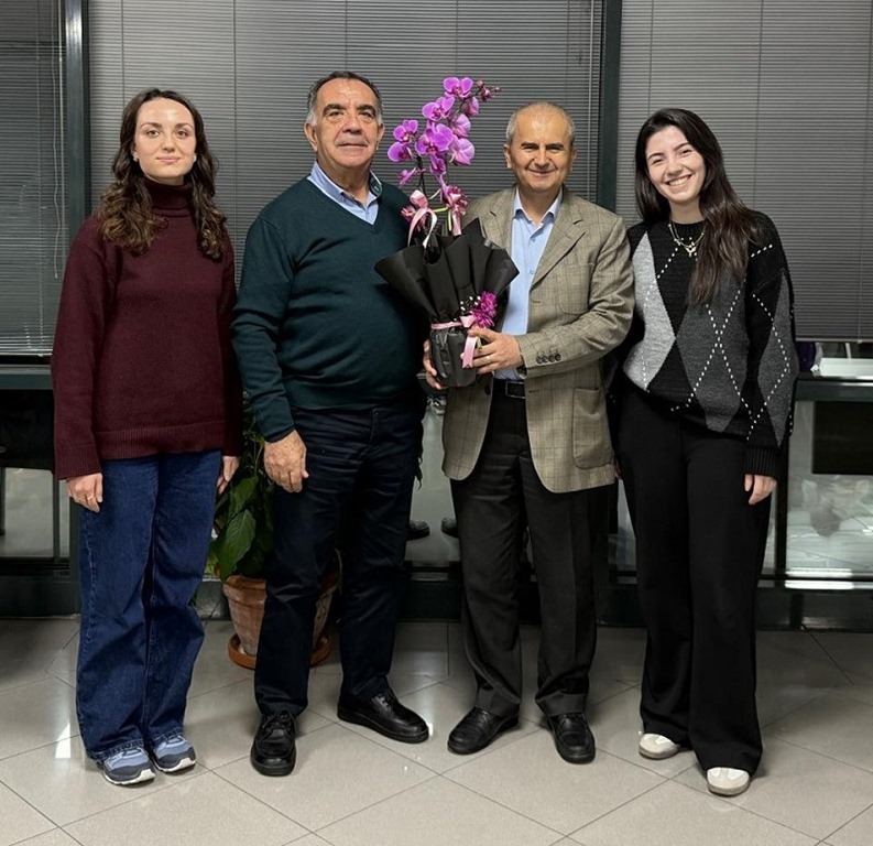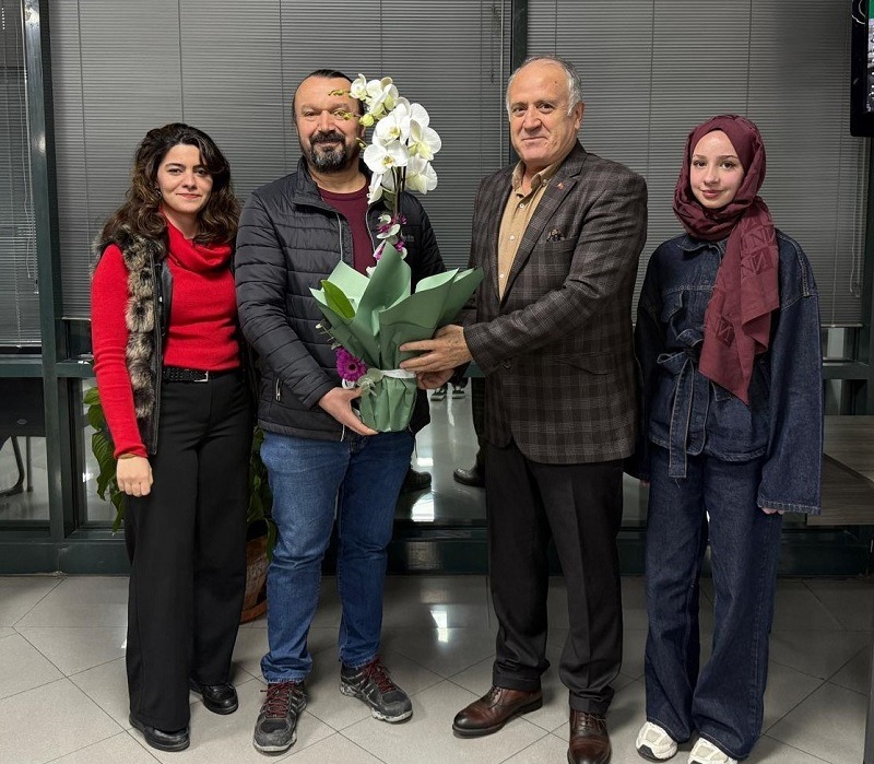 Dr. Hasan Dermenci’ye hediyesini İş İnsanı Necati Büyükkaya, İç Mimar Havva Nur Mut, Kocaeli Sağlık ve Teknoloji Üniversitesi Eczacılık Fakültesi 2. Sınıf öğrencisi Edanur Çapçı,