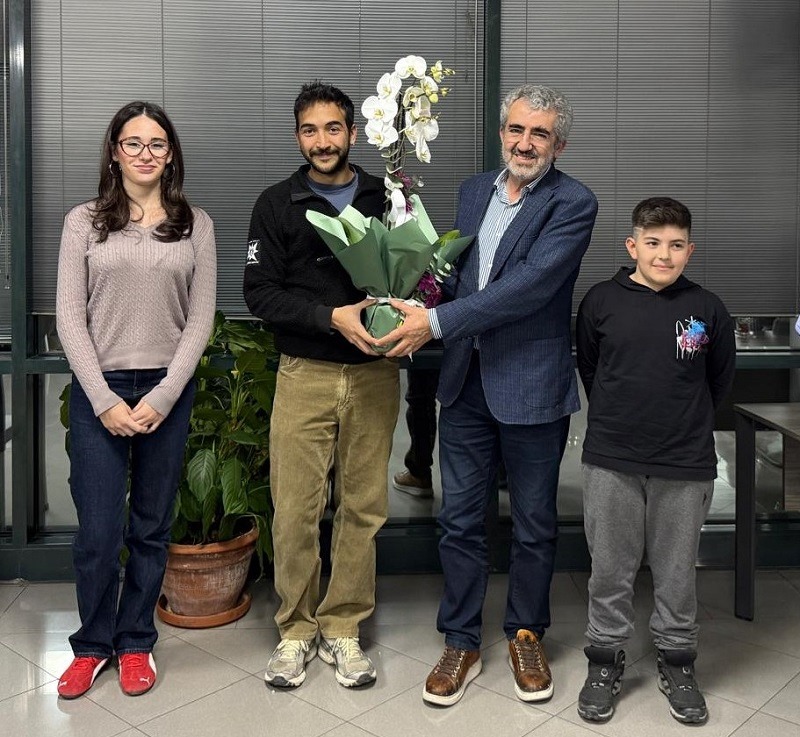 Dr. Gökhan Yavuz Bayram’a hediyesini İTÜ Öğretim Üyesi Prof. Dr. Ali Demir, Piri Reis Üniversitesi İktisadi ve İdari Bilimler Fakültesi Ekonomi ve Finans Bölümü 1. Sınıf öğrencisi Ayşe Aslı İpekli, ilkokul 4. Sınıf öğrencisi Cihan Yiğit Mut,